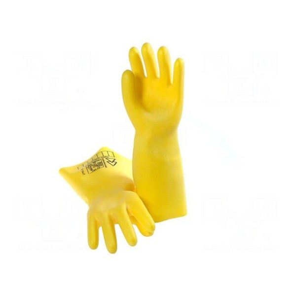 Rękawice elektroizolacyjne o rozmiarze 11 przeznaczone są do pracy przy instalacjach elektrycznych pod napięciem do 500V AC. Element charakteryzuje się klasą 00 zgodnie z normą PN-EN 60903 oraz napięciem próby wynoszącym 2,5kV. Konstrukcja o grubości 0,5mm zapewnia prąd upływu na poziomie 12mA.