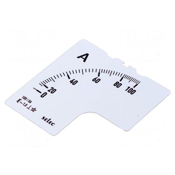 Prezentowana skala przeznaczona jest do współpracy z amperomierzami analogowymi marki Selec. Element umożliwia odczyt wartości prądu przemiennego w zakresie od 0 do 1,6 kA.