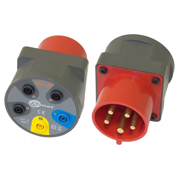 Adapter trójfazowy przeznaczony jest do wykonywania pomiarów w gniazdach przemysłowych. Konstrukcja urządzenia składa się z wtyku CEE x5 oraz pięciu gniazd bananowych, co umożliwia podłączenie aparatury pomiarowej do instalacji o prądzie znamionowym 32A.