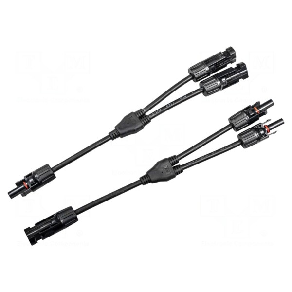 Adapter pomiarowy przeznaczony do pracy w systemach fotowoltaicznych. Element umożliwia bezpieczne połączenie aparatury kontrolno-pomiarowej z instalacją PV za pomocą standardowych gniazd bananowych oraz złączy MC4.