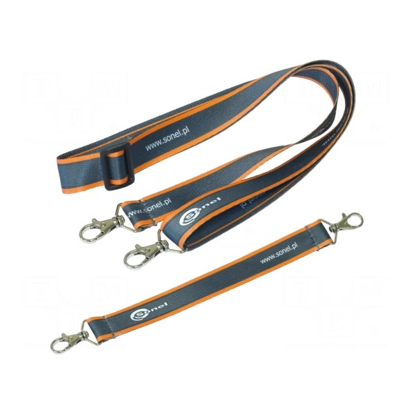 Pasek do mierników marki Sonel wykonany został z połączenia metalu oraz tkaniny. Produkt charakteryzuje się kolorystyką łączącą barwę pomarańczową oraz szarą.