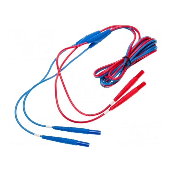 Przewód pomiarowy o prądzie znamionowym 10A zakończony jest obustronnie izolowanymi wtykami bananowymi o średnicy 4 mm. Całkowita długość elementu wynosi 3 m, co umożliwia wygodne połączenia w układach pomiarowych. Kabel wykonany jest w kolorystyce czerwono-niebieskiej.