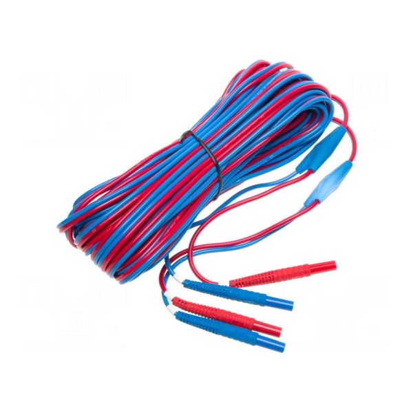 Przewód pomiarowy o długości 15 metrów przystosowany jest do pracy z prądem znamionowym o natężeniu 10 A. Konstrukcja przewodu opiera się na obustronnym zakończeniu dwoma wtykami bananowymi o średnicy 4 mm.