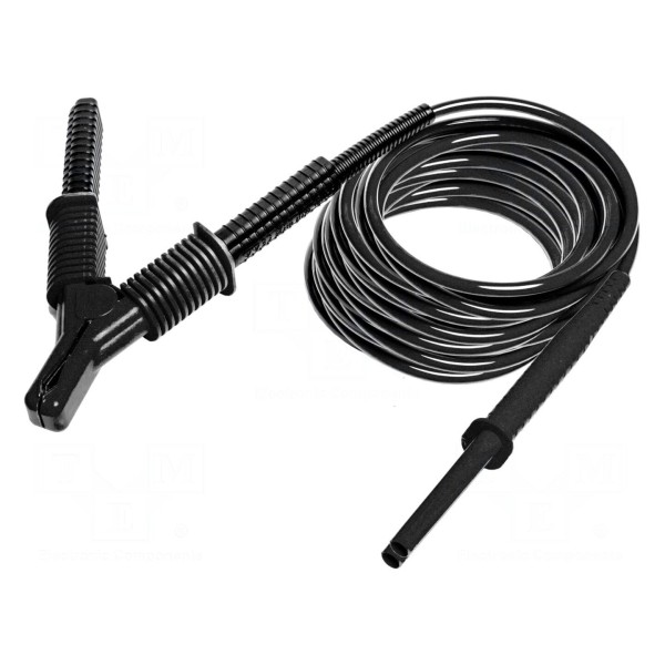 Konstrukcja przewodu obejmuje wtyk bananowy 4mm oraz zacisk krokodylkowy w kolorze czarnym. Komponent spełnia wymogi normy EN 61010 oraz kategorii pomiarowej CAT IV 1000V.