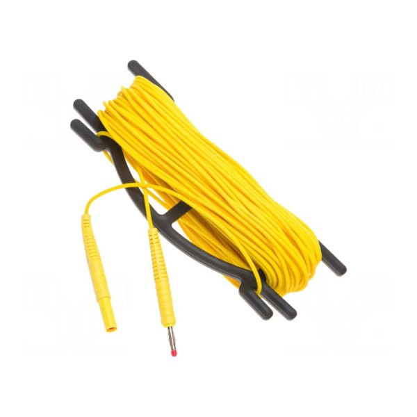 Przewód pomiarowy w kolorze żółtym charakteryzuje się długością 30 m. Konstrukcja elementu obejmuje wtyki bananowe 4 mm umieszczone po obu stronach przewodu.