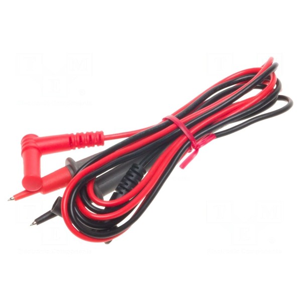 Zestaw zawiera dwa przewody pomiarowe przeznaczone do wykonywania pomiarów elektrycznych. W skład kompletu wchodzi jeden przewód w kolorze czarnym oraz jeden przewód w kolorze czerwonym.