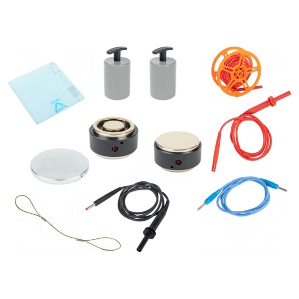 W zestawie: ciężarek dociskowy x2, łącznik dystansowy, płytka izolacyjna, przewód pomiarowy na szpuli, przewody pomiarowe x3, sonda okrągła, sondy pomiarowe x2. Urządzenie jest przystosowane do współpracy z wybranymi modelami mierników dostępnymi w ofercie producenta.