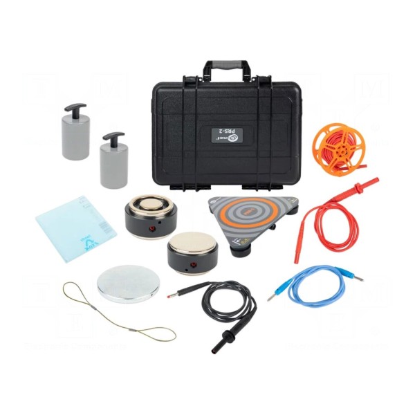 W zestawie: ciężarek dociskowy (2 szt.), łącznik dystansowy, płytka izolacyjna, przewód pomiarowy na szpuli, przewody pomiarowe (3 szt.), sonda okrągła, sondy pomiarowe (3 szt.) oraz walizka transportowa. Całość wyposażenia dostarczana jest w dedykowanym opakowaniu ułatwiającym przechowywanie i transport komponentów zestawu.