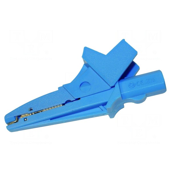 Element posiada niebieski kolor obudowy i jest przystosowany do montażu wtykowego za pomocą gniazda 4mm. Konstrukcja zacisku jest zgodna z wymogami norm CAT III 1000V oraz EN 61010, co określa parametry bezpiecznej eksploatacji w warunkach pomiarowych.