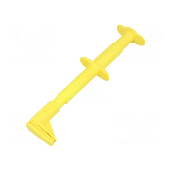 Produkt wykonany jest w żółtym kolorze i spełnia wymogi bezpieczeństwa zgodnie z normami CAT III 600V oraz EN 61010. Konstrukcja chwytaka przystosowana jest do bezpiecznej pracy w profesjonalnych środowiskach laboratoryjnych i serwisowych.