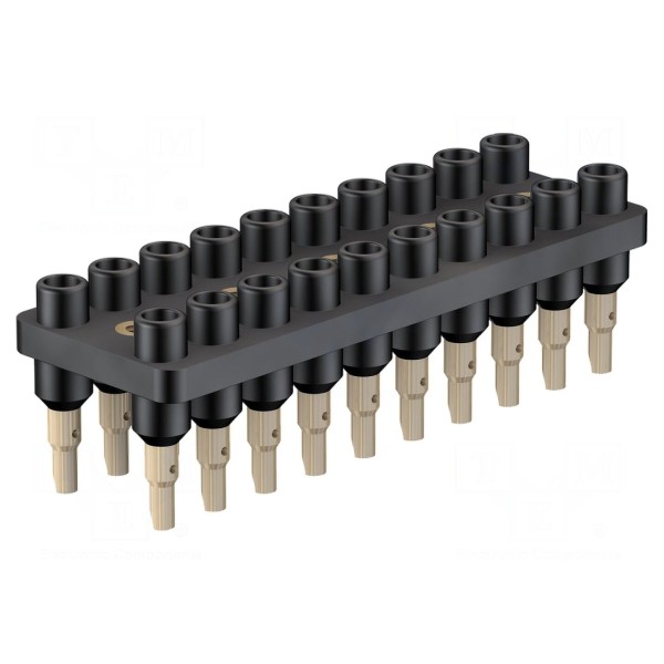 Listwa gniazdowa Stäubli BL2-12/20/A-21 przeznaczona jest do współpracy ze złączami bananowymi o średnicy 2mm. Element wyposażony jest w 20 gniazd umieszczonych w rzędach o rastrze 12mm, co umożliwia organizację połączeń w systemach pomiarowych. Konstrukcja bazuje na stykach wykonanych z mosiądzu, które dla poprawy parametrów przewodzenia oraz odporności na korozję zostały pokryte warstwą złota.