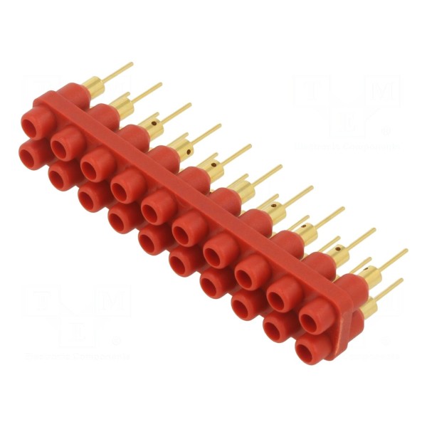 Listwa gniazdowa przeznaczona do złączy bananowych 2mm wyposażona jest w 20 gniazd rozmieszczonych w rastrze 6mm. Element ten charakteryzuje się prądem znamionowym 10A oraz dopuszczalnym napięciem znamionowym 30V AC i 60V DC.