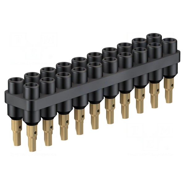 Listwa gniazdowa posiada 20 gniazd przeznaczonych dla wtyków bananowych o średnicy 2mm. Element charakteryzuje się rozstawem między rzędami wynoszącym 6mm i jest utrzymany w czarnej kolorystyce.