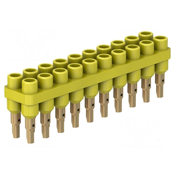 Listwa gniazdowa wyposażona w 20 gniazd typu bananowego o średnicy 2mm. Element przeznaczony jest do pracy z napięciem znamionowym 33V AC oraz 70V DC, przy zachowaniu dopuszczalnego prądu znamionowego na poziomie 10A.