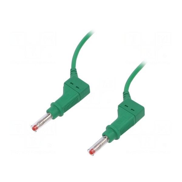 Konstrukcja złączy obejmuje izolowane wtyki z gniazdem osiowym 4mm oraz suwaną osłoną, co wpływa na obsługę połączeń. Zastosowana izolacja z PVC chroni przewód, a produkt jest zgodny z normą bezpieczeństwa CAT II 600V zgodnie z EN 61010. Całość wykonana jest w zielonym kolorze.