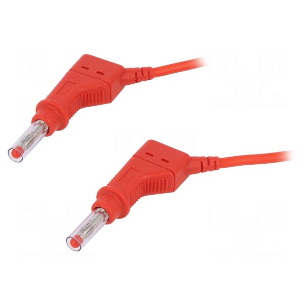 Konstrukcja złączy obejmuje izolację, gniazdo osiowe 4mm oraz suwaną osłonę. Przewód posiada izolację wykonaną z PVC oraz jest zgodny z normami CAT II 600V i EN 61010. Produkt występuje w kolorze czerwonym.