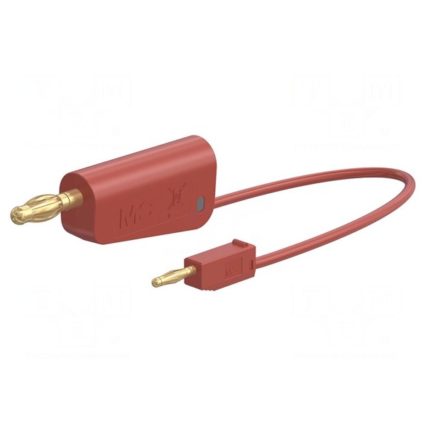 Przewód pomiarowy o długości 0,3 m wyposażony jest we wtyki bananowe o średnicach 2 mm oraz 4 mm. Konstrukcja złącza obejmuje nieizolowane elementy okrągłe z gniazdami osiowymi 2 mm oraz 4 mm. Styki wykonano z mosiądzu i poddano procesowi złocenia w celu poprawy parametrów połączenia.