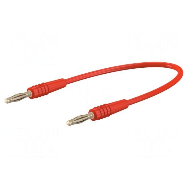 Przewód pomiarowy wyposażony w nieizolowane wtyki bananowe 2mm umieszczone po obu stronach kabla. Element charakteryzuje się przekrojem żyły wynoszącym 0,5 mm² oraz izolacją wykonaną z PVC w kolorze czerwonym.