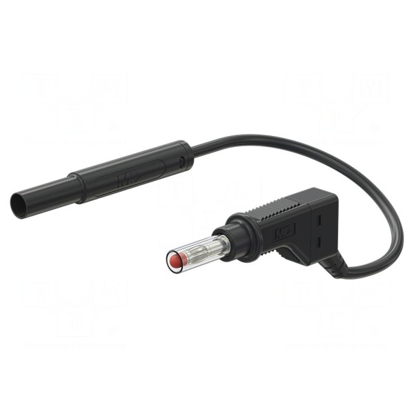 Przewód pomiarowy o długości 2 metrów przystosowany jest do pracy z prądem znamionowym 19A. Konstrukcja elementu opiera się na prostym wtyku bananowym 4mm oraz wtyku bananowym kątowym 4mm, co ułatwia podłączenie w różnych konfiguracjach stanowiskowych. Przekrój przewodu wynosi 1mm².