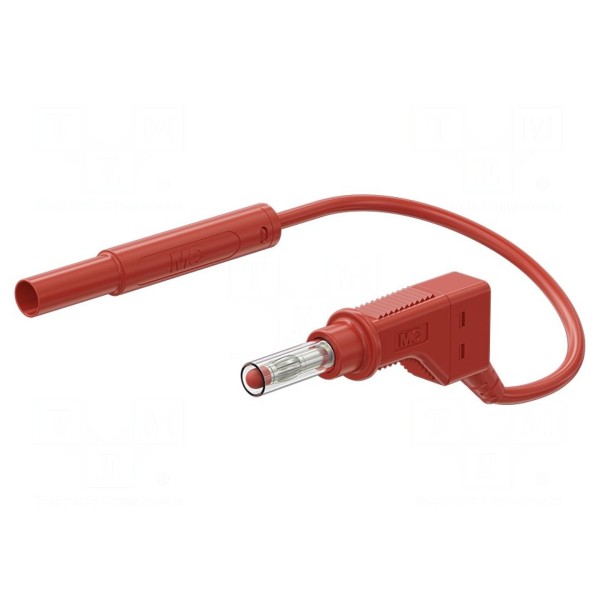 Przewód pomiarowy o długości 2 metrów przystosowany jest do pracy z prądem znamionowym o natężeniu 19A. Konstrukcja elementu obejmuje wtyk bananowy 4mm oraz wtyk bananowy kątowy 4mm, które posiadają powierzchnie stykowe pokryte warstwą niklu. Żyła przewodu o przekroju 1mm² chroniona jest izolacją wykonaną z materiału PVC w kolorze czerwonym.