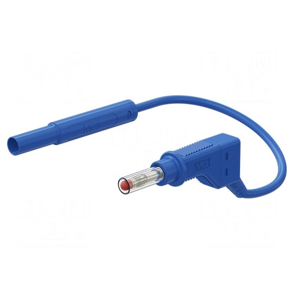 Przewód pomiarowy STÄUBLI o długości 2 metrów przystosowany jest do pracy z prądem znamionowym 19A. Konstrukcja elementu obejmuje wtyk bananowy 4mm oraz wtyk bananowy kątowy 4mm, co umożliwia wygodne podłączenie w różnych układach pomiarowych. Przekrój przewodu wynosi 1mm², a izolacja zewnętrzna wykonana została z PVC w kolorze niebieskim.
