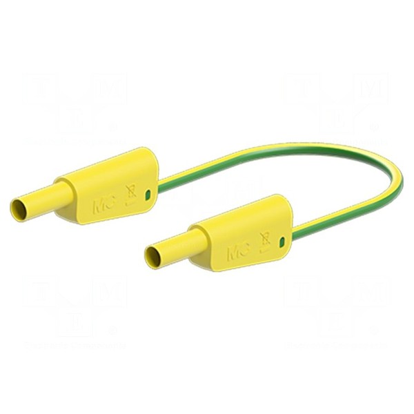 Przewód pomiarowy o długości 0,75 m wyposażony jest obustronnie we wtyki bananowe 4 mm. Konstrukcja złączy obejmuje izolację oraz gniazdo osiowe 4 mm, a styki zostały poddane procesowi złocenia w celu zapewnienia odpowiedniego połączenia. Żyła przewodu o przekroju 1 mm² zabezpieczona jest powłoką izolacyjną wykonaną z PVC w kolorze żółto-zielonym.