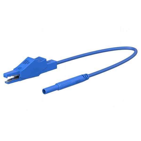 Przewód pomiarowy o długości 1 m wyposażony jest w wtyk bananowy 2 mm oraz zacisk krokodylkowy. Konstrukcja charakteryzuje się prądem znamionowym 10 A oraz napięciem znamionowym 0,6 kV. Przekrój przewodu wynosi 0,75 mm².