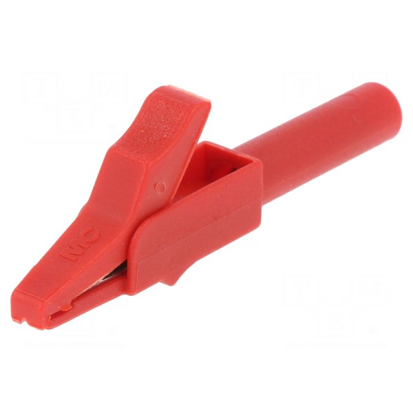 Zacisk krokodylkowy przeznaczony jest do współpracy z gniazdami o rozmiarze 4mm. Element charakteryzuje się prądem znamionowym wynoszącym 15A oraz napięciem znamionowym 0,3kV. Powierzchnia styku została wykonana w technologii niklowanej, co wpływa na parametry połączeniowe. Obudowa zacisku posiada kolor czerwony. Produkt spełnia wymagania normy EN 61010 w kategorii przepięciowej CAT II 300V. Konstrukcja zapewnia dopasowanie do standardowych przewodów pomiarowych wyposażonych w końcówki 4mm.