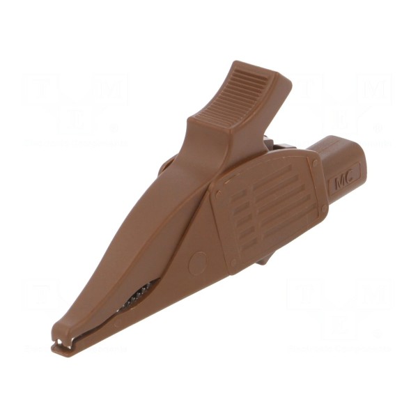 Konstrukcja urządzenia umożliwia chwytanie elementów o maksymalnej średnicy 30mm. Zacisk posiada gniazdo w rozmiarze 4mm, co zapewnia kompatybilność z typowymi przewodami pomiarowymi. Produkt utrzymany jest w kolorze brązowym.