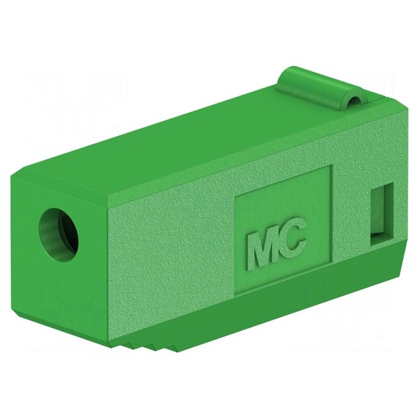 Gniazdo przeznaczone jest do wtyków bananowych o średnicy 2mm. Element charakteryzuje się długością całkowitą wynoszącą 15,5mm. Obudowa złącza wykonana jest w kolorze zielonym. Komponent przeznaczony jest do wykorzystania z wtykami bananowymi.