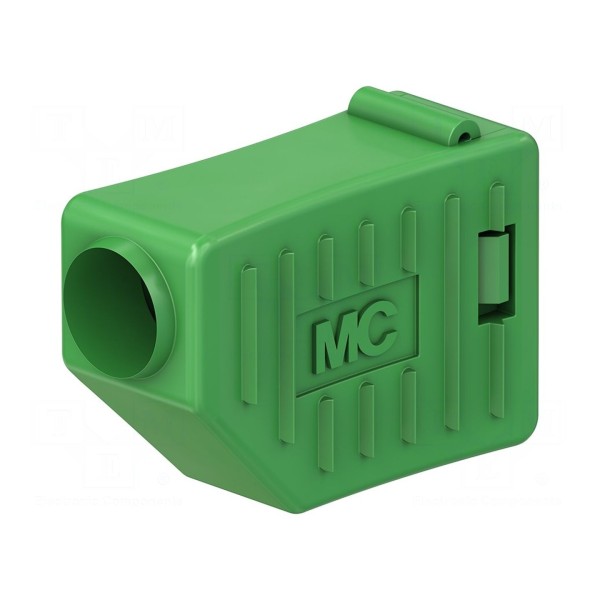 Obudowa przeznaczona do wtyków bananowych o rozmiarze 4 mm. Komponent charakteryzuje się długością całkowitą wynoszącą 17,8 mm i jest wykończony w kolorze zielonym.