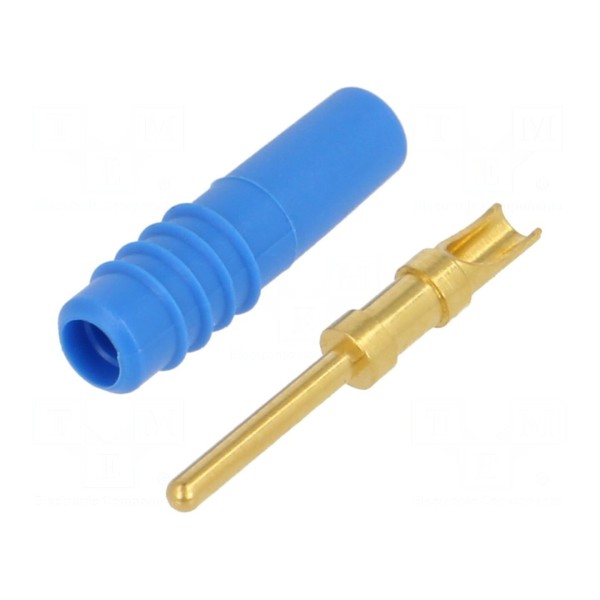 Element charakteryzuje się złoconym pokryciem styku, co wpływa na parametry połączenia. Montaż przewodu odbywa się przez lutowanie, a konstrukcja dopuszcza zastosowanie przewodów o maksymalnej średnicy 0,25mm. Produkt utrzymany jest w kolorze niebieskim, a jego całkowita długość wynosi 19mm.