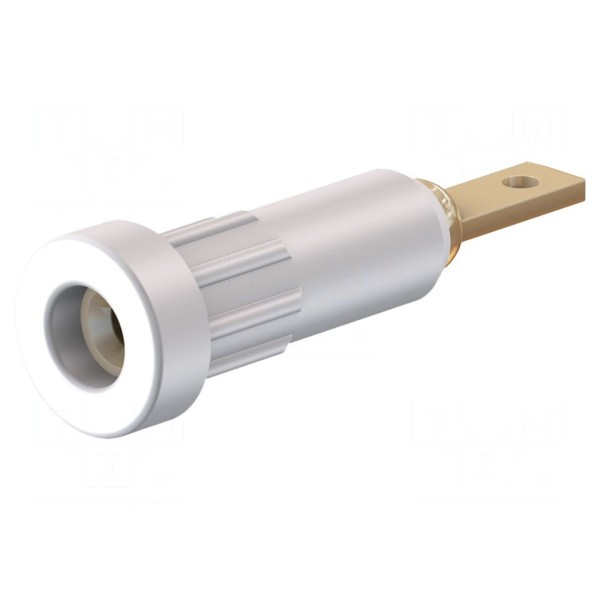 Złącze w kolorze białym posiada izolowaną konstrukcję oraz pozłacane styki wykonane z mosiądzu. Całkowita długość elementu wynosi 23mm, a montaż odbywa się metodą lutowania w otworze o średnicy 4,9mm.
