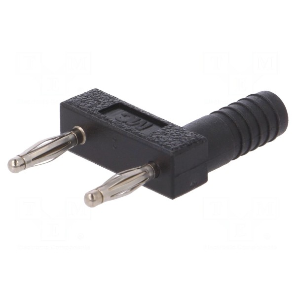 Złącze typu mostek zwierny z serii bananowej 2mm zostało wykonane z mosiądzu z niklowaną powierzchnią styków. Konstrukcja elementu obejmuje jedno gniazdo bananowe 2mm oraz dwa wtyki bananowe 2mm, co umożliwia realizację połączeń w obwodach laboratoryjnych.