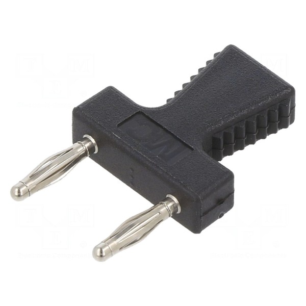 Mostek zwierny typu banan 2mm przeznaczony jest do łączenia punktów pomiarowych. Element charakteryzuje się rozstawem wtyków wynoszącym 12 mm oraz budową obejmującą jedno gniazdo bananowe 2 mm i dwa wtyki bananowe 2 mm. Całkowita długość złącza wynosi 30,4 mm, a obudowa wykonana jest w kolorze czarnym.