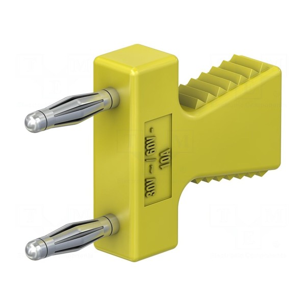 Styk wykonany jest z mosiądzu, który został poddany procesowi niklowania w celu poprawy parametrów technicznych. Element przystosowany jest do pracy przy prądzie znamionowym 10A oraz napięciu roboczym 30V AC lub 60V DC. Produkt dostępny jest w kolorze żółtym.