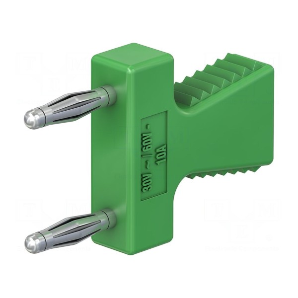 Złącze laboratoryjne typu mostek zwierny wyposażone w gniazdo oraz dwa wtyki bananowe o średnicy 2mm. Element charakteryzuje się rozstawem wtyków wynoszącym 12mm oraz całkowitą długością 30,4mm. Obudowa w kolorze zielonym została wykonana z mosiądzu z niklowaną powierzchnią styków, co zapewnia parametry przewodnictwa w układach pomiarowych.
