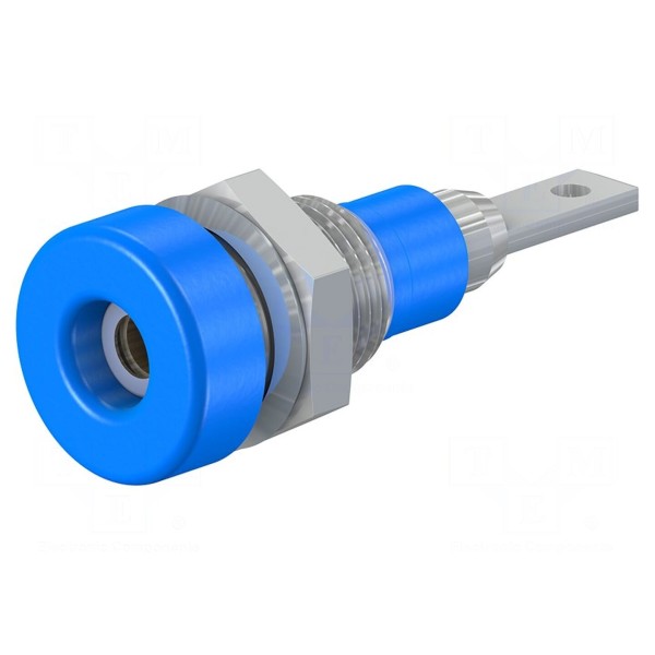 Złącze laboratoryjne typu gniazdo bananowe 2mm w kolorze niebieskim przeznaczone jest do montażu na panelu. Element charakteryzuje się prądem znamionowym 10A oraz dopuszczalnym napięciem pracy 30V AC i 60V DC.