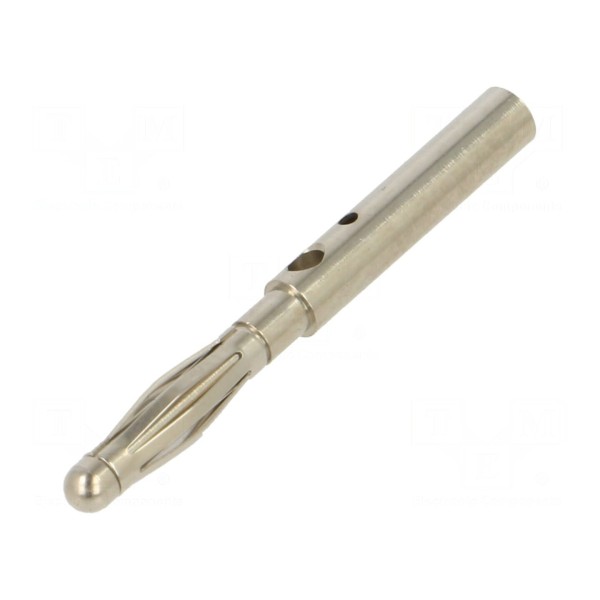 Złącze typu wtyk bananowy o średnicy 2 mm przeznaczone jest do prac laboratoryjnych. Element charakteryzuje się prądem znamionowym wynoszącym 10 A oraz dopuszczalnym napięciem roboczym 30 V AC lub 60 V DC.