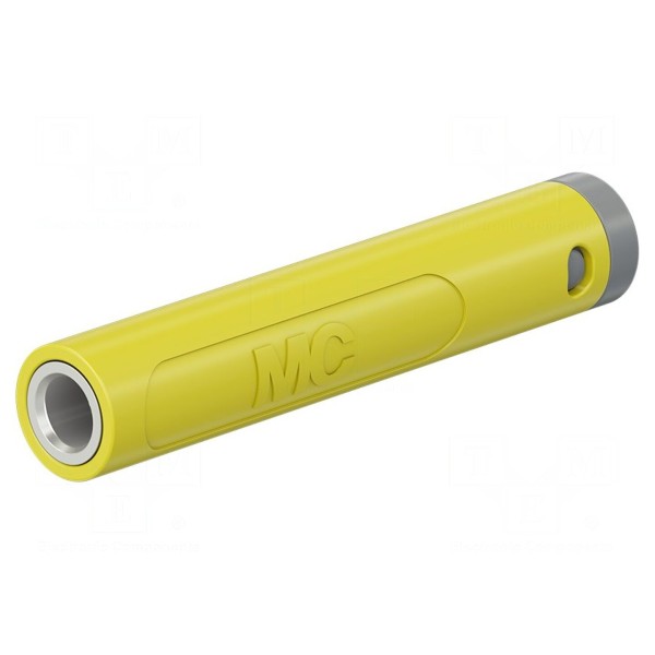 Konstrukcja elementu jest nieizolowana i została wyposażona w dodatkowe gniazdo poprzeczne 4mm. Powierzchnia styku została wykończona niklowaniem, co zapewnia trwałość połączenia. Złącze występuje w kolorze żółtym.