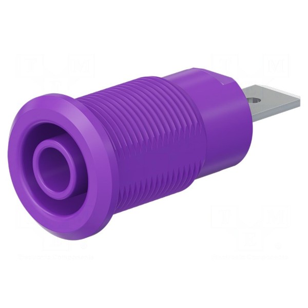 Złącze bananowe 4mm typu gniazdo przeznaczone jest do pracy w instalacjach o napięciu znamionowym 1kV oraz prądzie do 32A. Element wykonany został z mosiądzu z niklowanym pokryciem styku, co zapewnia właściwe parametry przewodzenia. Konstrukcja charakteryzuje się izolowaną wersją oraz fioletową kolorystyką obudowy.