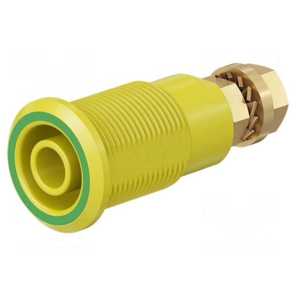 Złącze laboratoryjne typu gniazdo bananowe o średnicy 4 mm przeznaczone jest do pracy przy prądzie znamionowym do 32 A. Element posiada styk wykonany z mosiądzu z powłoką złoconą, co zapewnia parametry połączeniowe. Obudowa złącza wykonana jest w kolorze żółto-zielonym.