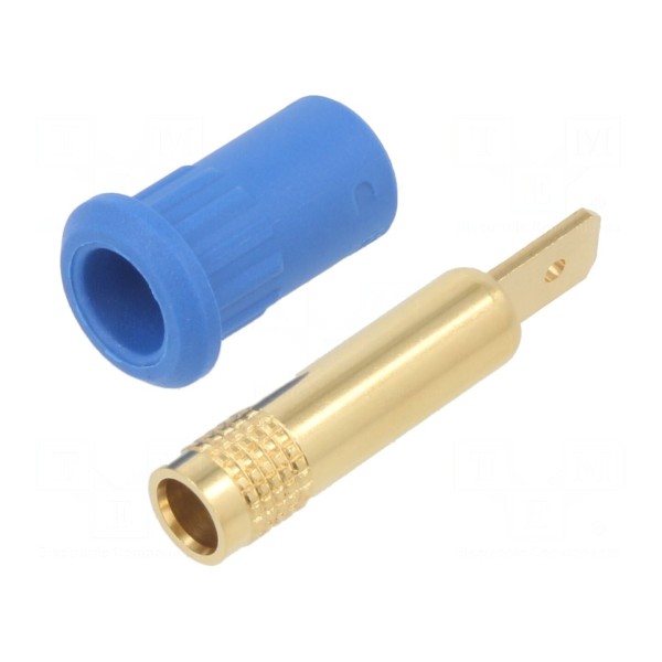 Konstrukcja gniazda posiada pozłacane pokrycie styku, co wpływa na parametry połączenia. Montaż elementu odbywa się poprzez lutowanie, a jego całkowita długość wynosi 30 mm. Produkt dostępny jest w kolorze niebieskim.