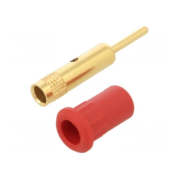 Styk złącza poddano procesowi złocenia, co wpływa na parametry połączenia. Montaż komponentu odbywa się na panelu przy wykorzystaniu wtyku pinowego o średnicy 1,9 mm. Całkowita długość elementu wynosi 34,5 mm, a obudowa wykonana jest w kolorze czerwonym.