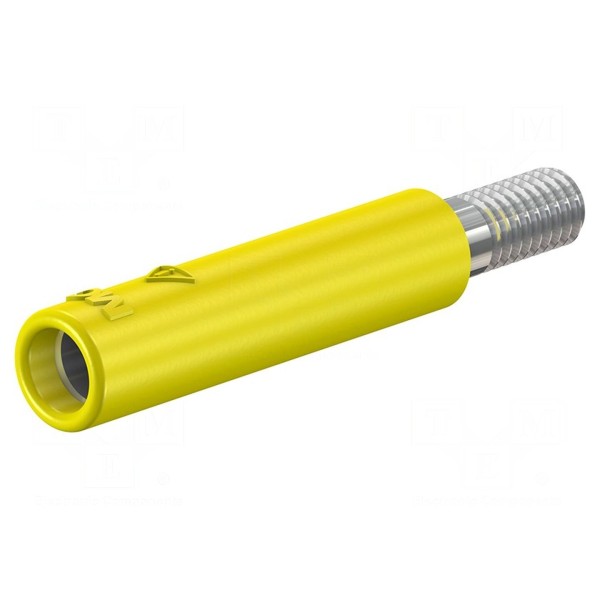 Element wyposażony jest w niklowany styk wykonany z mosiądzu, co zapewnia przewodność w warunkach laboratoryjnych. Montaż odbywa się za pomocą gwintu M4, przy czym złącze posiada konstrukcję przykręcaną. Długość całkowita elementu wynosi 34,5mm, a obudowa wykonana jest w kolorze żółtym.