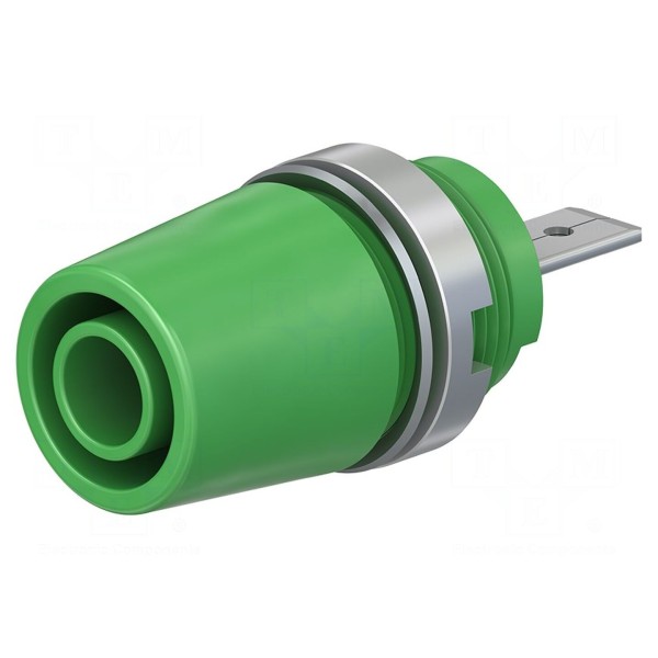 Złącze bananowe typu gniazdo przeznaczone jest do pracy z napięciem znamionowym 1kV oraz prądem o natężeniu 20A. Komponent charakteryzuje się izolowaną konstrukcją oraz stykami wykonanymi z mosiądzu z powłoką niklowaną, co zapewnia odpowiednie parametry przewodzenia. Całość utrzymana jest w zielonej kolorystyce.