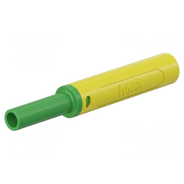 Konstrukcja złącza jest przeznaczona do montażu przykręcanego, co zapewnia stabilność połączenia. Całkowita długość komponentu wynosi 65mm, a jego kolorystyka to żółto-zielony. Wykonanie elementu zapewnia zgodność z normami bezpieczeństwa, w tym CAT II 1000V, CAT III 600V oraz EN 61010.