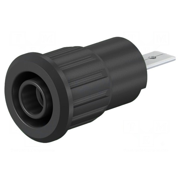 Złącze bananowe o średnicy 4mm jest izolowanym gniazdem przeznaczonym do montażu panelowego metodą lutowaną. Element przystosowany jest do pracy z napięciem znamionowym do 1kV oraz prądem znamionowym 24A.