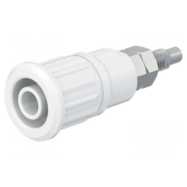 Gniazdo bananowe o średnicy 4 mm przeznaczone do zastosowań laboratoryjnych. Element charakteryzuje się napięciem znamionowym 1 kV oraz prądem znamionowym 32 A. Styki złącza zostały wykończone poprzez niklowanie, co zapewnia odpowiednie parametry przewodzenia.