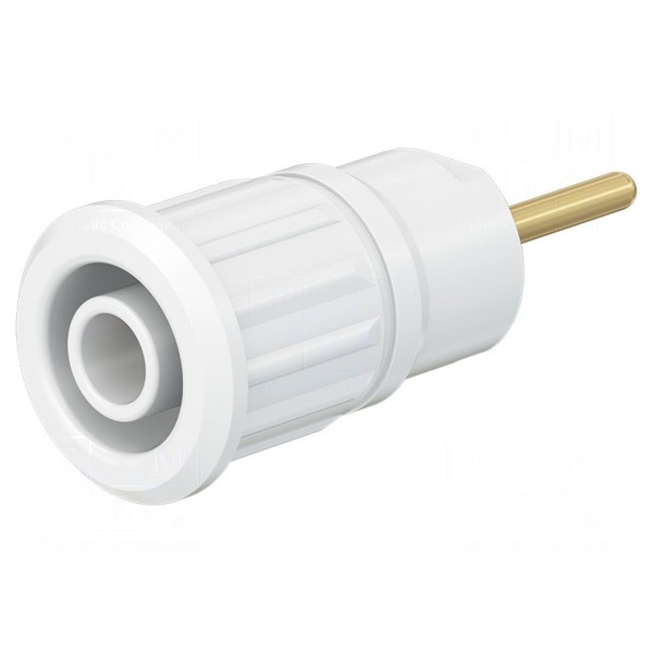 Komponent przystosowany jest do montażu wtykowego w otworze o średnicy 12,2mm. Całkowita długość złącza wynosi 35,5mm, a jego kolor to biały. Zgodność z normami CAT III 1000V oraz EN 61010 zapewnia odpowiednie parametry dla aplikacji laboratoryjnych.
